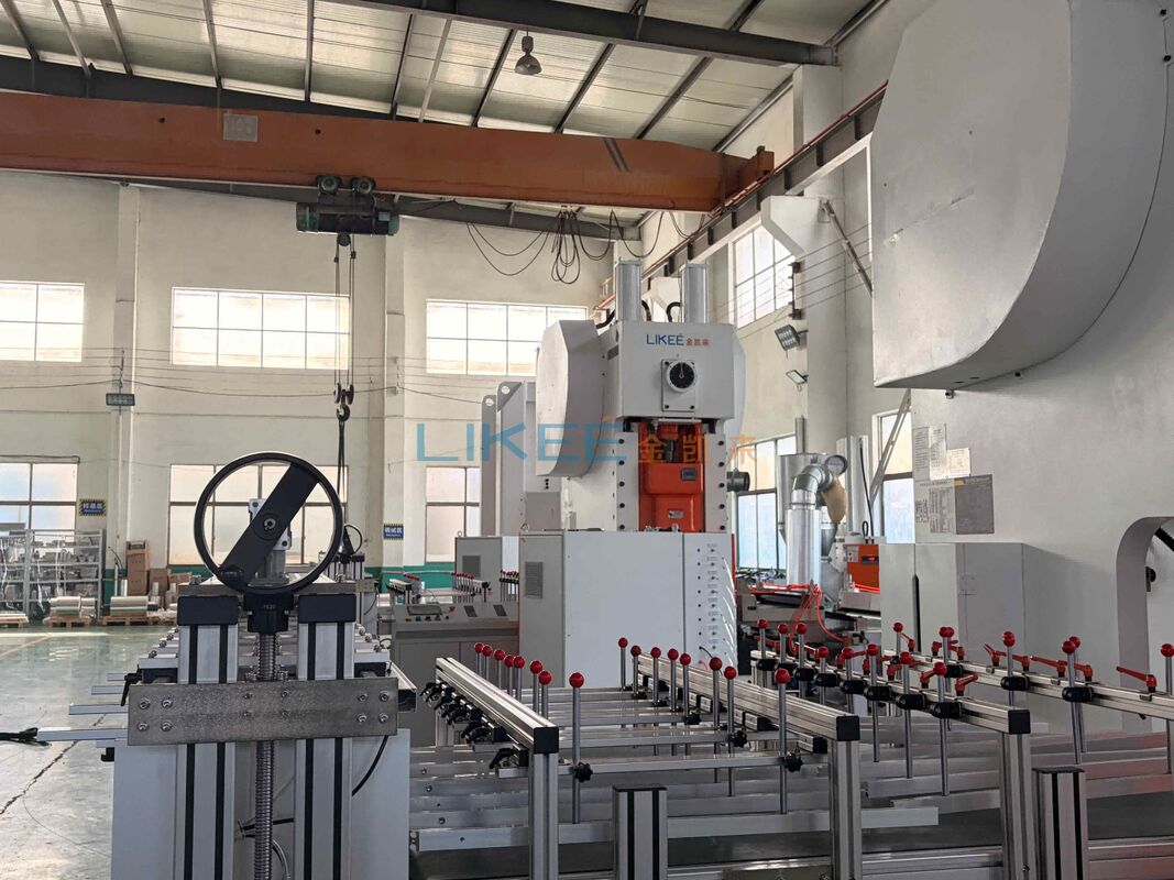 The LK-T63 comes with a control cabinet and scrap suction as standard. The cabinet uses Mitsubishi PLC, Siemens/ABB motor, and Schneider components - standard brands your local electrician can fix. The scrap suction pulls aluminum edge trim off the press continuously, so you don't need someone sweeping the floor. We've built these lines for 15 years, shipped to 30+ countries (US, Russia, Brazil, Saudi Arabia, etc.). One operator runs it 24 hours. Speed: 50 strokes/min average, 9,000-12,000 pieces/hour on three-cavity molds. Solid bed plate (not hollow), handles 0.025-0.2mm foil, especially stable on thin foil. Hydraulic lifting arm lets one person change molds in 15 minutes. Touchscreen stores 60 mold parameters. Faults trigger auto-stop and display on screen. Safety door stops the machine when opened. Machine life 10 years, frame over 30 years. 1-year warranty, parts at cost after. CE, ISO9001, ISO14001. Free sample measurement: mail us your container, we'll confirm mold specs before you order.
